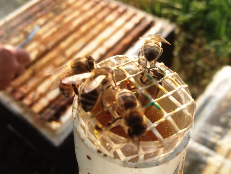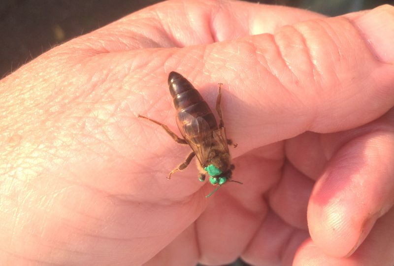 Met zeer goede hulp is de nieuwe koningin gevonden en hier in een kokertje geïsoleerd om haar te merken.