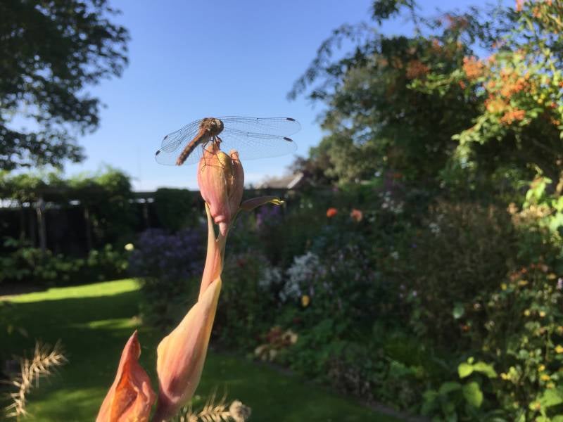 Een zonnende libel op een uitgebloeide gladiool.