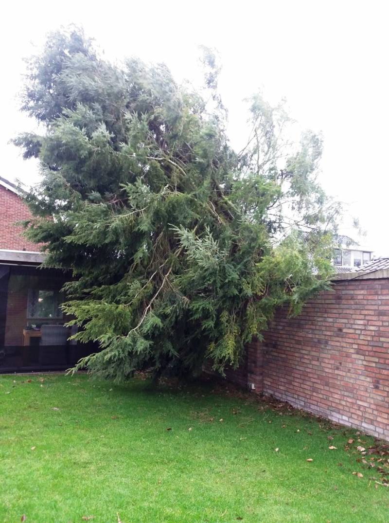 De vraag was of we de conifeer achter het kasje zouden laten staan. We twijfelden zo erg, dat het voordeel van de twijfel de conifeer in eerste instantie redde. Maar een storm in januari 2018 bleek de nekslag. Hij lag bij de buren over de schutting en moest worden omgezaagd. Het was een boom met een herinnering, dat was spijtig, maar wel fijn dat er voor ons beslist werd.